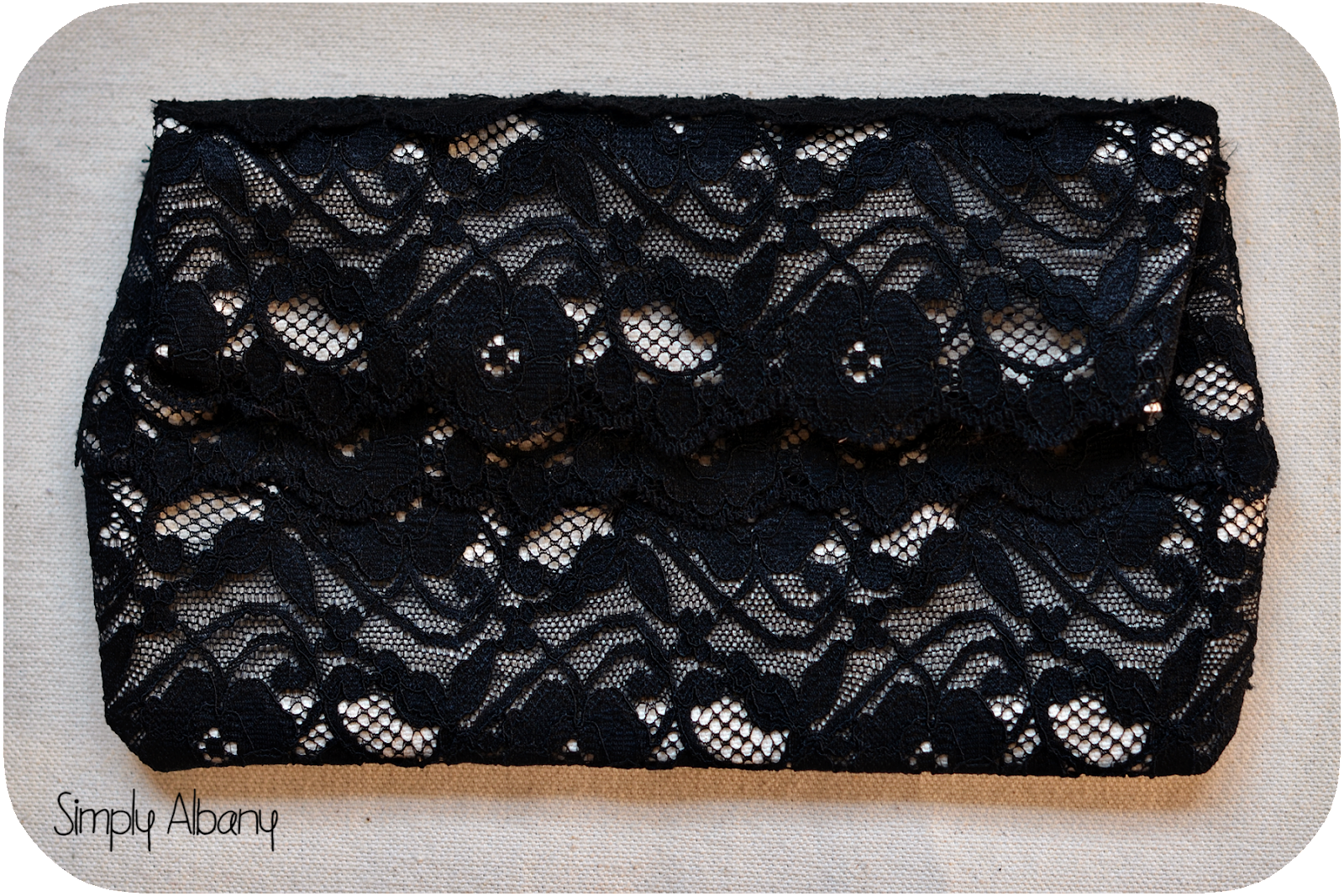 After success with Amanda's tutorial for her bow tie clutch (my take on it here), I decided to make a lace clutch. I used the lace trim from an old tank top, sewn on top of some solid canvas.